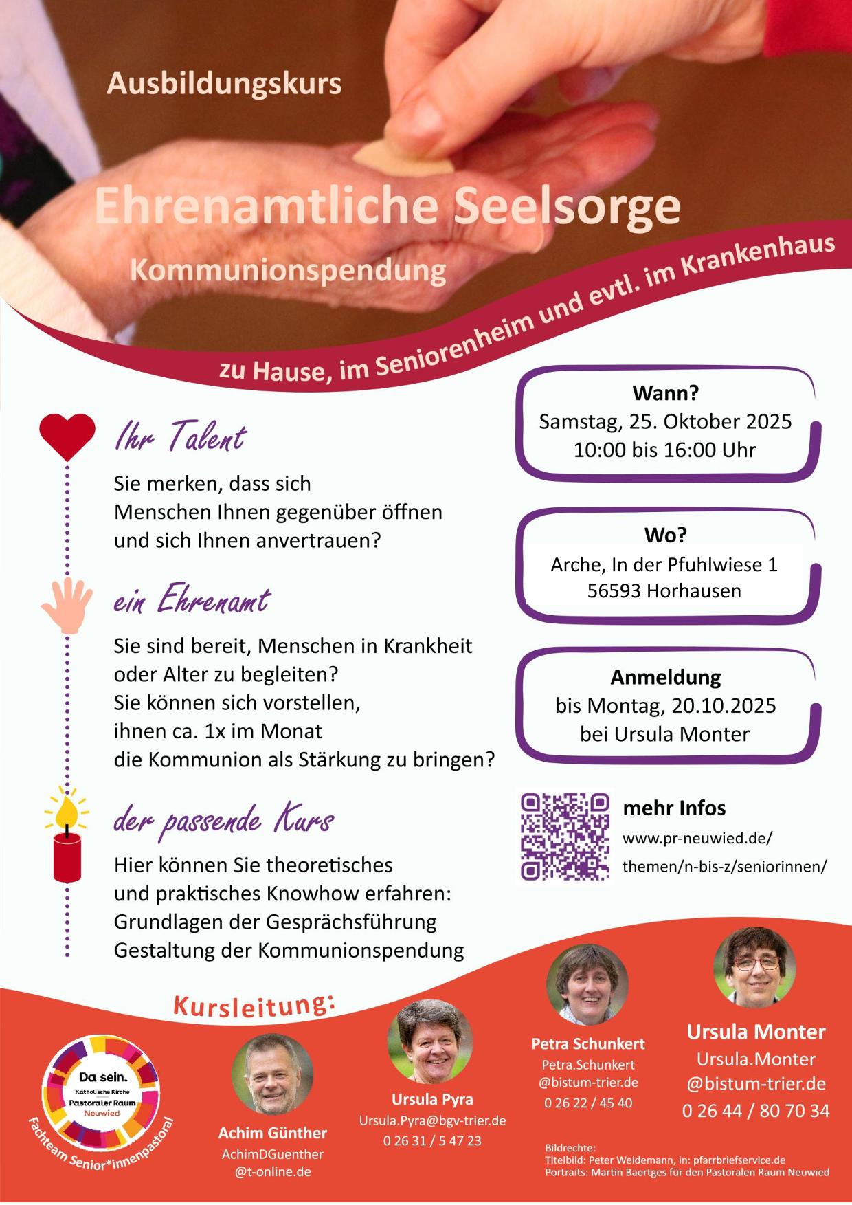 Für Sie bieten wir einen kleinen Ausbildungskurs am Samstag, 25. Oktober von 10.00 bis 16.00 Uhr in Horhausen an. Die Teilnehmenden werden geschult, ältere oder kranke Menschen zu besuchen und mit ihnen die Hauskommunion zu feiern.