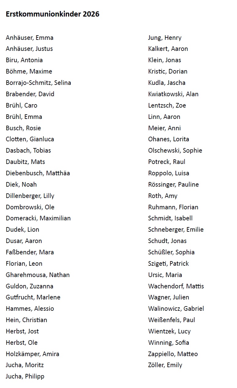 Wir wünschen allen Kindern und ihren Familien einen schönen Festtag sowie Gottes Segen und hoffen, dass sie auf ihrem Lebensweg Jesus als Wegbegleiter an ihrer Seite spüren und sich von ihm leiten lassen. Alle Gemeindemitglieder bitten wir um ihr begleitendes Gebet für die Kommunionkinder und deren Familien.