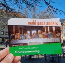 Am Gründonnerstag, 2. April wollen wir in Neuwied die Abendmahlszene des Bildes von Leonardo da Vinci in Form eines Straßentheaters „Mahl ganz anders“ an vier öffentlichen Plätzen nachspielen. Dazu werden Menschen gesucht, die Lust haben mitzuwirken. Darstellerinnen und Darsteller sind ebenso willkommen wie