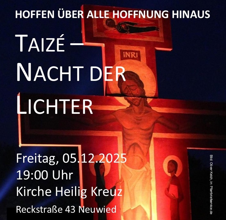 Am 5.Dezember 2025 um 19.00Uhr findet in der Pfarrkirche „Hl.Kreuz“, Reckstr.43, Neuwied, ein ökumenisches Abendlob unter dem Motto „Hoffen über alle Hoffnung hinaus“ mit Gebeten und Gesängen aus Taizé statt.