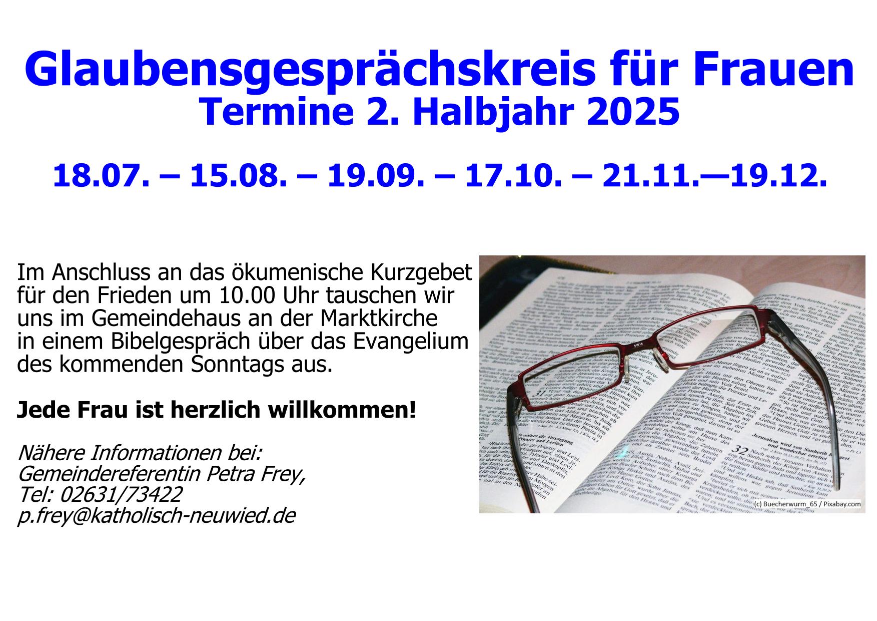 Glaubensgesprächskreis für Frauen – alle Termine 2025 Von Zentralbuero|2025-09-10T14:14:37+02:00September 9th, 2025|Allgemein|Kommentare deaktiviert für Glaubensgesprächskreis für Frauen – alle Termine 2025 Ähnliche Beiträge Impuls der Woche Gallerie Impuls der Woche Fort- und Weiterbildungsangebot für ehrenamtlich Engagierte Gallerie Fort- und Weiterbildungsangebot für ehrenamtlich Engagierte Umgang mit dem neuen Bestattungsgesetz in Rheinland-Pfalz Gallerie Umgang mit dem neuen Bestattungsgesetz in Rheinland-Pfalz Rollenverteilung Krippenspiel St. Michael am 23. November Gallerie Rollenverteilung Krippenspiel St. Michael am 23. November