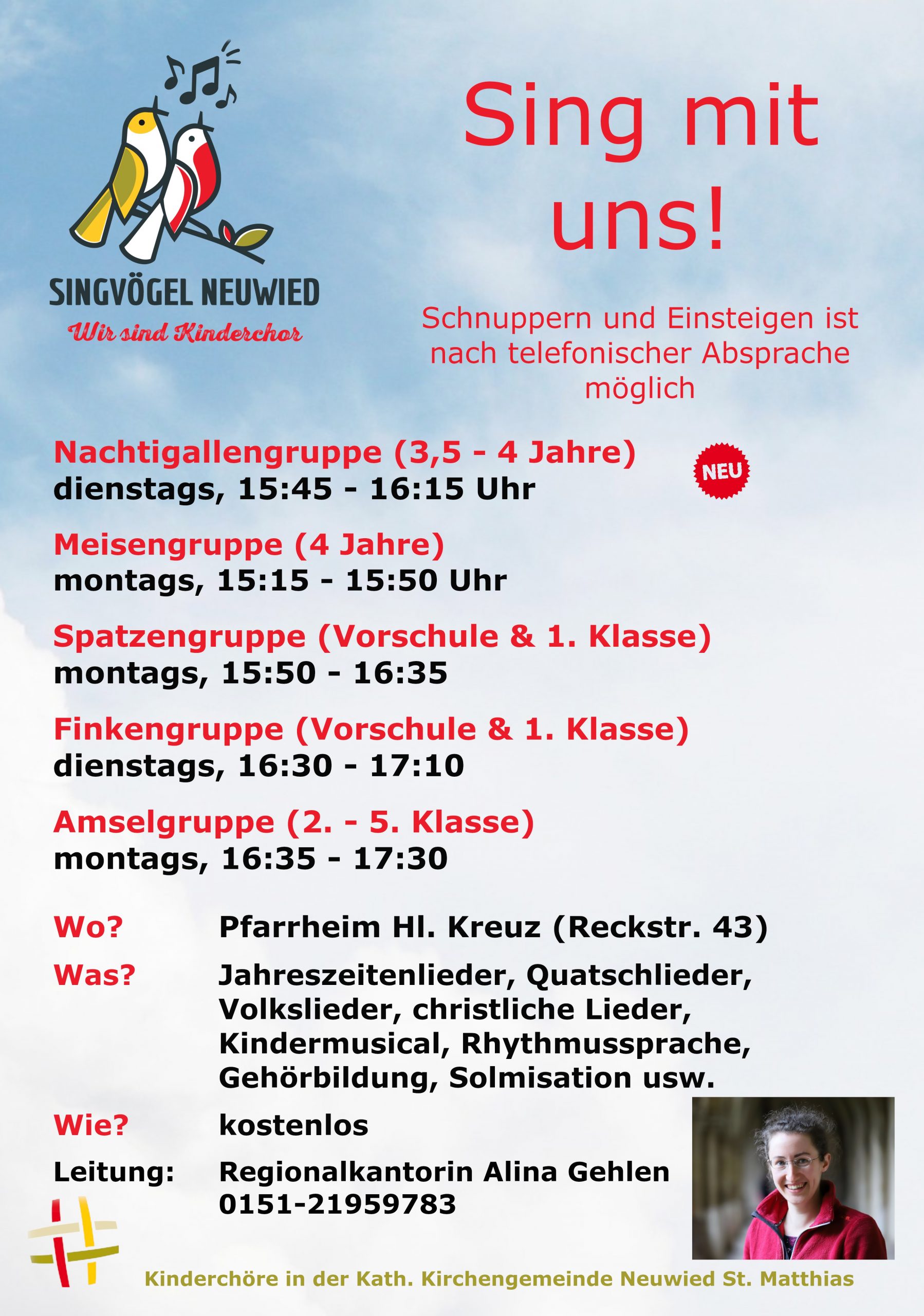Die Warteliste für alle 3-4jährigen kleinen Sänger*innen hat ein Ende. Ab dem 10.03.2026 startet dienstags von 15:45 – 16:15 Uhr im Pfarrheim Hl. Kreuz (Reckstr. 43) eine neue Kinderchorgruppe der Singvögel Neuwied.