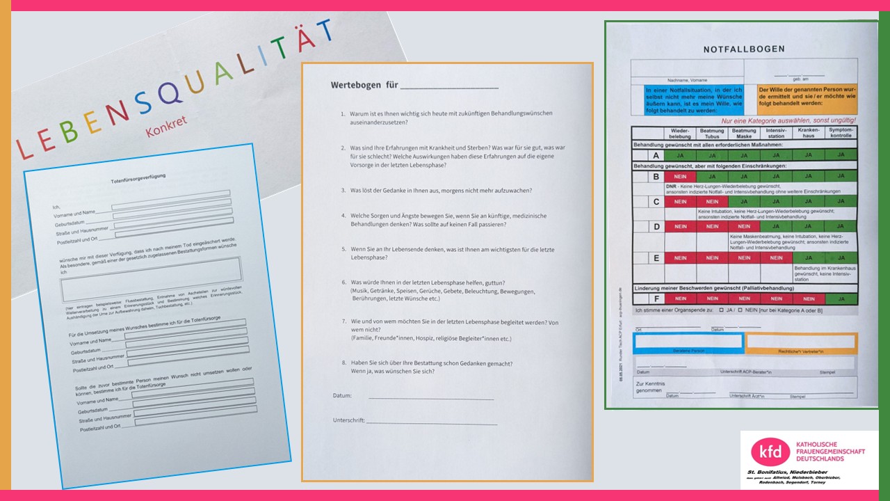 Durch die aktive Teilnahme der Besucher war es ein gelungener kfd-Abend mit dem Fazit: Eine rechtzeitige und gute Vorsorge ist wichtig. Wenn alles geregelt ist, kann man ganz beruhigt sein und entspannt in die Zukunft schauen.