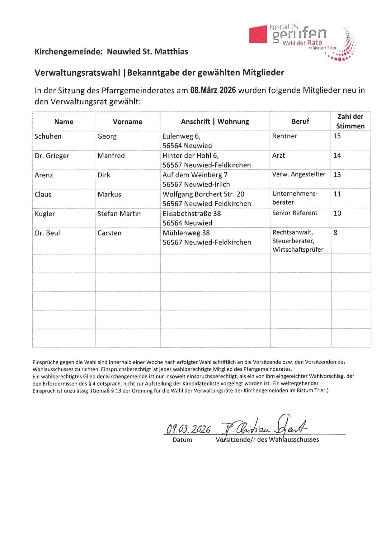 Verwaltungsratswahl | Bekanntgabe der gewählten Mitglieder Von Zentralbuero|2026-03-10T11:23:14+01:00März 10th, 2026|Allgemein|Kommentare deaktiviert für Verwaltungsratswahl | Bekanntgabe der gewählten Mitglieder Ähnliche Beiträge Stellenanzeige für das Pfarrbüro Neuwied St. Matthias Gallerie Stellenanzeige für das Pfarrbüro Neuwied St. Matthias Bischöfliche Beauftragung zur Spendung der Hauskommunion Gallerie Bischöfliche Beauftragung zur Spendung der Hauskommunion Impuls der Woche Gallerie Impuls der Woche Die Kandidaten zur Wahl des Verwaltungsrats Gallerie Die Kandidaten zur Wahl des Verwaltungsrats